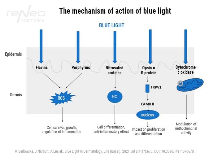 Numerous studies have shown that exposure to blue light causes excessive generation of ROS in cultured human keratinocytes and dermal fibroblasts. In addition, blue light reduces the expression of genes that regulate mitochondrial function, such as early growth response protein 1 (EGR1) and Forkhead Box O1 protein (FOXO1) in primary human keratinocytes and melanocytes. It was also found that exposure to radiation in the range from 360 to 470 nm causes the formation of ROS from carbonylated proteins located in the stratum corneum. This suggests that blue light plays a greater role than UV in the formation of such ROS. Excessive blue light-induced ROS production is associated with decreased cell viability and/or cell proliferation, increased proinflammatory response, and impaired collagen metabolism. Dermal fibroblasts exposed to blue light exhibited general metabolic inhibition, decreased ATP synthesis, impaired transforming growth factor-ฮฒ signaling (TGF-ฮฒ), decreased procollagen I synthesis, and decreased collagen lattice contractility. Therefore, blue light can harm cells primarily not by suppressing their antioxidant defenses, but by constantly producing a small amount of free radicals that can bypass the body’s normal defense mechanisms and permanently damage DNA. Although blue light therapy can be used to reduce inflammation in bacterial acne, ROS produced by overexposure to blue light cause inflammation, redness, and swelling. Continuous exposure to blue light can weaken the skin’s barrier function, making it less resistant to environmental damage and reducing the skin’s ability to retain moisture. Excessive production of active forms of nitrogen. In the dermis, blue light also causes the release of free nitric oxide, NO. It was found that: