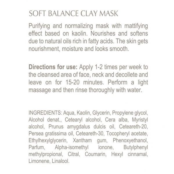 KAOLIN – white clay has a high absorption capacity and participates in stabilizing the electrolytic balance in the skin. Kaolin is a very delicate abrasive that has antibacterial properties and therefore is ideal for both sensitive skin and problematic skin with inflamed areas.
