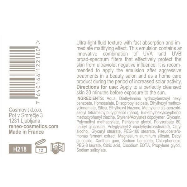 This sunscreen is a reliable protector of your skin from the aggressive effects of ultraviolet radiation, thanks to an innovative combination of UVA and UVB broad-spectrum filters. A high concentration of the biotechnological active ingredient – Matmarine (3%), reduces the functioning of the sebaceous glands, and makes the skin matte. The cream at the same time maintains the hydrobalance in the tissues, prevents transepidermal moisture loss. Glycerin (1%) restores the overall moisture level of the epidermis. It has a light fluid texture, the cream is instantly absorbed, leaving no feeling of greasy on the skin and shine, creates a matting effect.