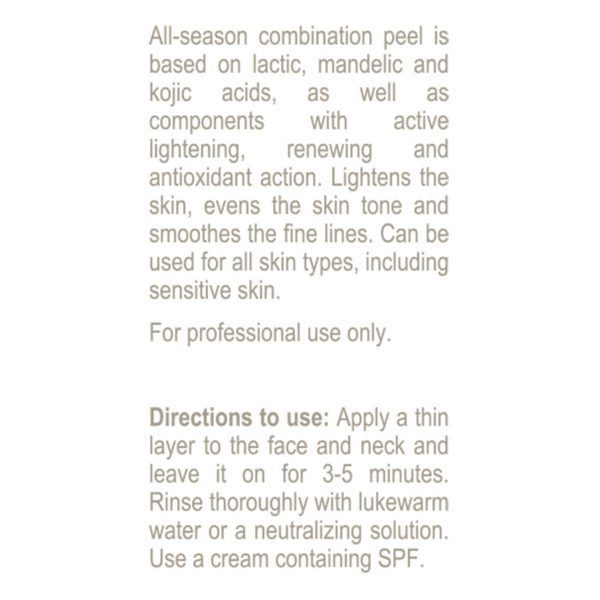 It has bactericidal, anti-inflammatory and keratolytic properties, evens out skin microrelief, eliminates dull skin color and smoothes fine lines. Helps to improve skin elasticity and turgor, has a sebo-regulating effect. Lactic acid does not irritate melanocytes, which allows it to be used in all seasons without complications to fight skin hyperpigmentation of any genesis.