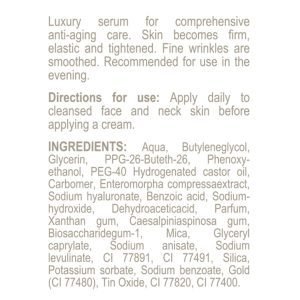 - LUXE-AGE GOLD FILLING SERUM P105 – anti aging serum with gold hydrosol for restoration of skin turgor, lifting and correction of noticeable age changes.