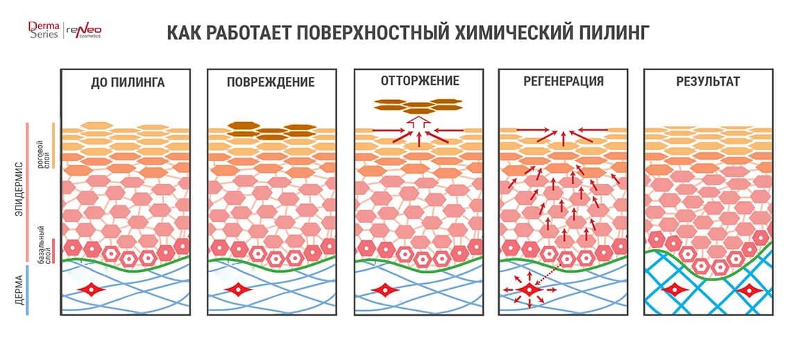 Главная задача пилинга – контролируемое повреждение верхних слоев кожи для стимуляции её обновления. Поверхностные химические пилинги работают в пределах эпидермиса. Кислота на поверхности кожи вызывает неспецифическое воспаление, которое приводит к синтезу белков шаперонов. Стимулируется деление клеток базального слоя, усиливается процесс регенерации, усиливается метаболическая активность клеток. Повышается синтез в ламеллярных гранулах, выделяются цитокины, нейропептиды, простогландины.