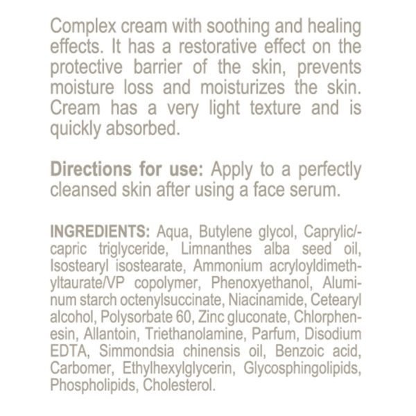 Легкий крем для восстановления баланса кожи идеально восстанавливает липидную мантию кожи, нормализует качественный и количественный состав жирных кислот на поверхности эпидермиса. Крем оказывает успокаивающее действие на кожу, снижая проявления воспалительных реакций.