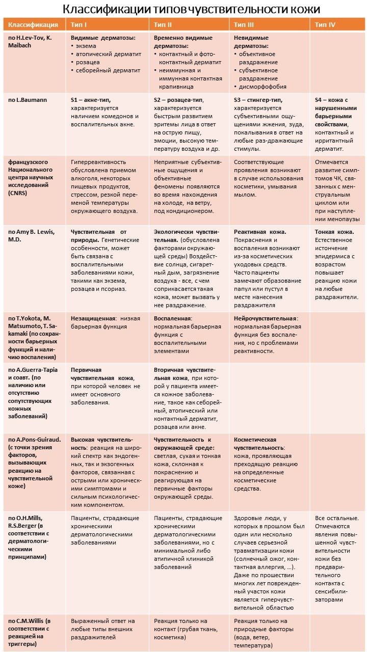 Разнообразие классификаций типов чувствительной кожи также отражает отсутствие единой позиции у дерматологов по данному вопросу: